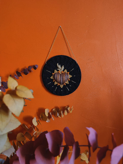 Chaque pièce est tissée et brodée à la main dans mon atelier, avec des fils recyclés, des fils français et des perles chinées. Ces créations artisanales uniques s’inspirent de la magie des symboles pour apporter poésie et sacré à ton intérieur.